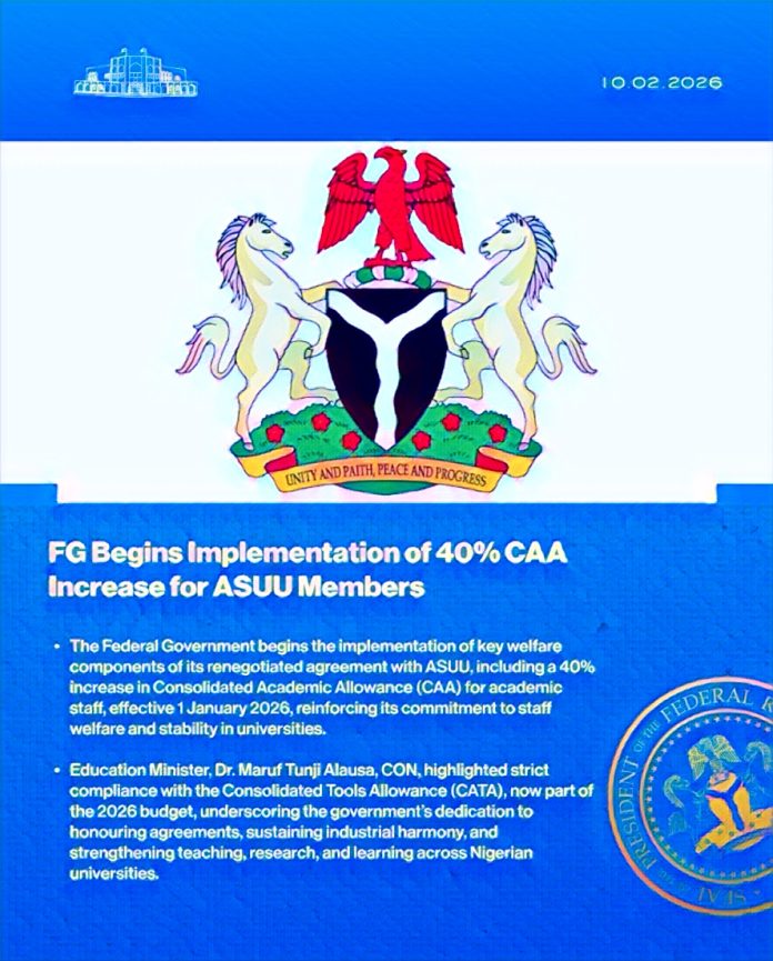 The Federal Government recently declared that it had commenced the implementation of key provisions contained in its renegotiated agreement with the Academic Staff Union of Universities, ASUU, including a 40 per cent increase in the Consolidated Academic Allowance (CAA) and the introduction of a new Consolidated Tools Allowance (CATA).