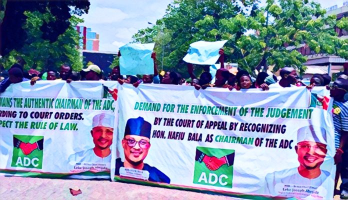 The leadership crisis within the African Democratic Congress, ADC, intensified on Thursday as a faction led by Nafiu Bala Gombe staged a protest at the headquarters of the Independent National Electoral Commission (INEC) in Abuja, demanding official recognition.